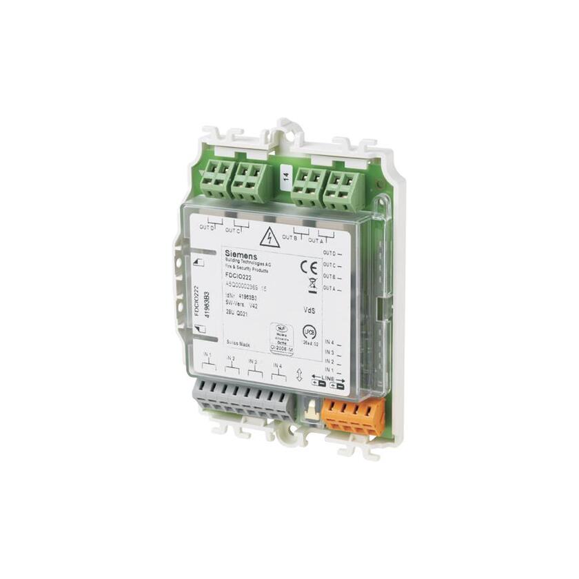 Siemens Cerberus PRO Adresabilni ulazno/izlazni modul sa VdS interfejsom za kontrolu i upravljanje gasenjem. 4 beznaponska monitorisana ulaza i 4 relejna izlaza (AC 250V / 4A). Napajanje sa FDnet/C-NET, IP30, dodavanjem kucista FDCH221 IP65