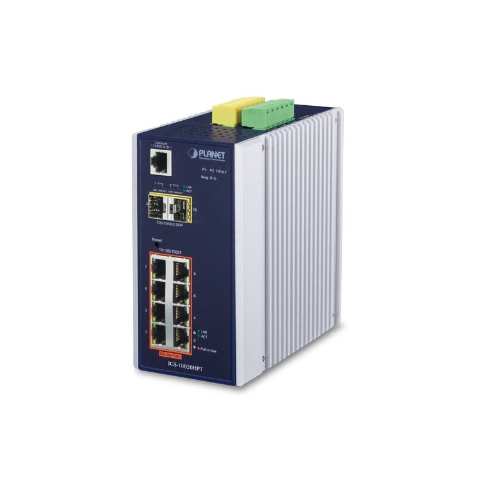 IGS-10020HPT 8-port 10/100/1000T 802.3at PoE + 2-port 1G/2.5G SFP industrijski L2+ Ring upravljivi Gigabit Ethernet PoE switch, RJ45 konzolni port, Planet