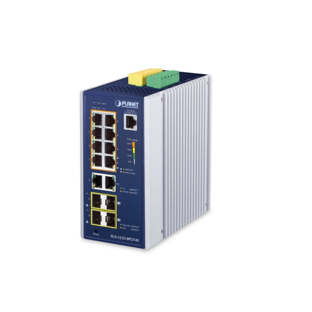IGS-5225-8P2T4S 8-Port 10/100/1000T 802.3at PoE + 2-Port 10/100/1000T + 2-Port 100/1G SFP + 2-Port 100/1G/2.5G SFP industrijski L2+ Ring upravljivi Gigabit Ethernet PoE switch, Planet